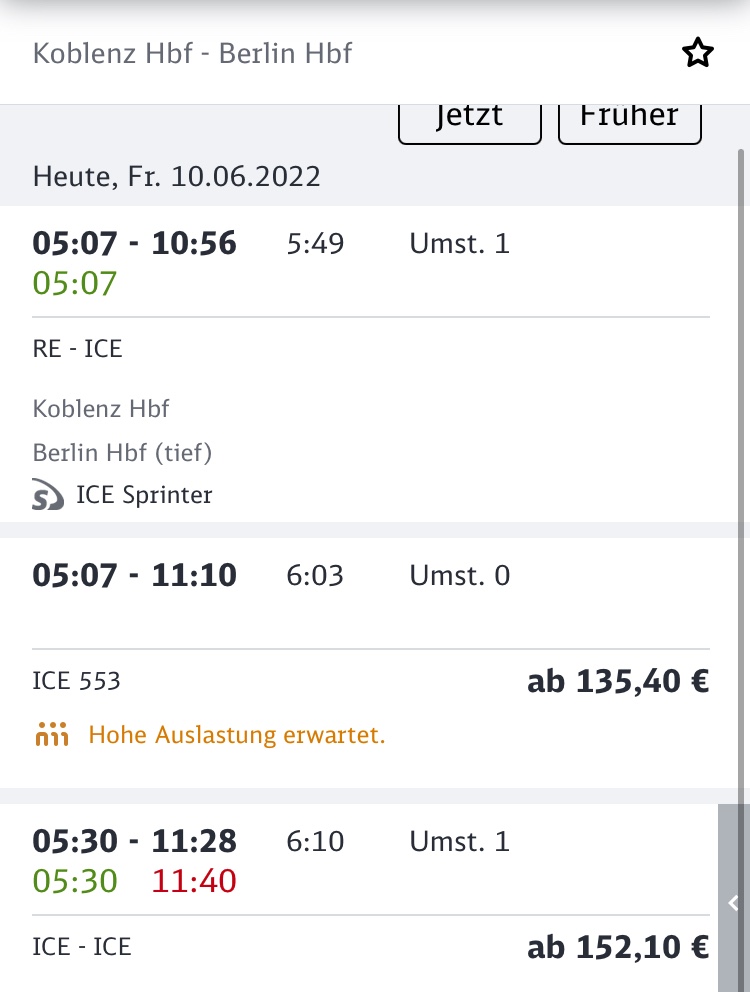 Weil wir gerade beim Geld sind: Die reguläre Fahrt mit dem Fernverkehr kostet 130€ eine Richtung. Das geht sogar ab Koblenz ganz ohne umsteigen, wenn man die frühe Abfahrtszeit nicht scheut – ebenfalls 5:07. Ich bin aber auch schon für 59€ nach Berlin gefahren. Fernbus ist sicher auch günstiger.