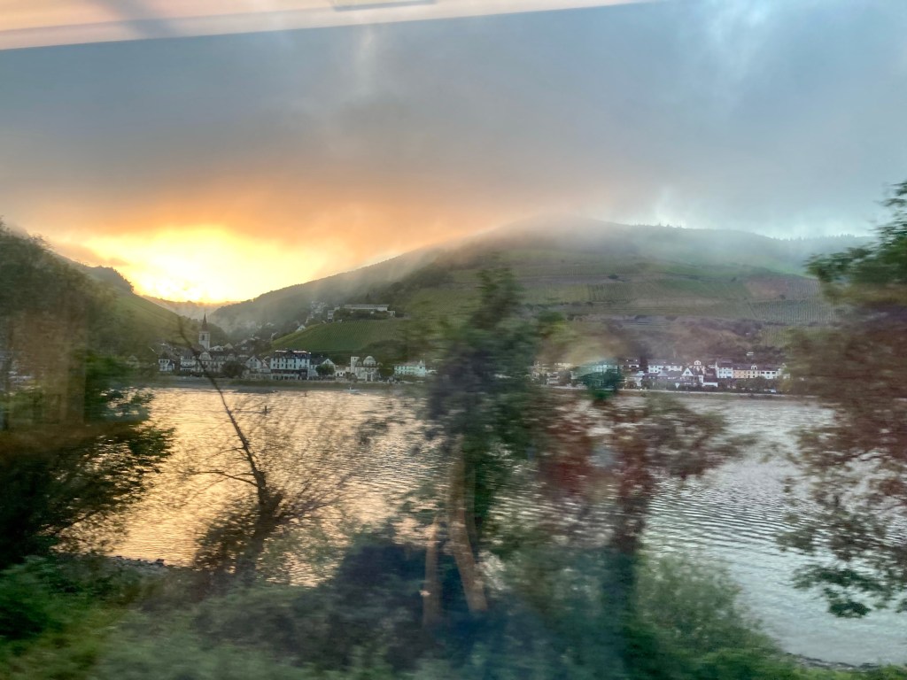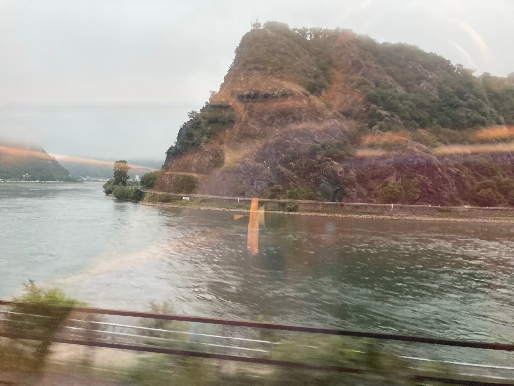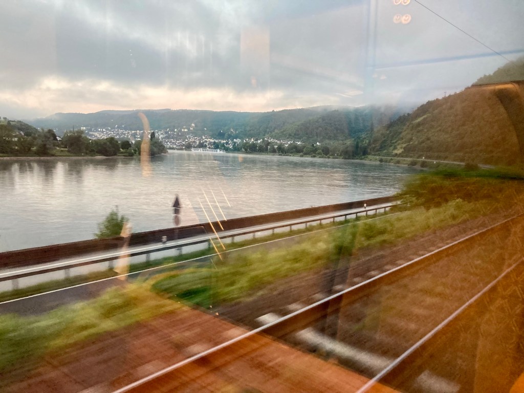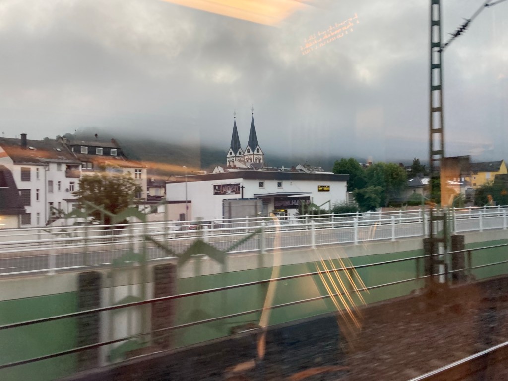 Nach Bingen wird es eine ganz normale Bahnreise ohne eine derart spektakuläre Kulisse. Wir sind pünktlich, die Stimmung ist entspannt und der Kontrolleur kommt schon zum x-ten Mal durch den Wagen. Es wäre nie eine blödere Idee als jetzt, kein 9€ oder sonstiges Ticket dabei zu haben und 60€ zahlen zu müssen. Aber es soll wohl vorkommen. In 2020 hatte ich sogar eine BahnCard 100 und fuhr mit Bahn und Rad kreuz und quer durch die Lande, um meine Bücher beim Buchhandel bekannt zu machen. Die Bücher bei Ampel Publishing