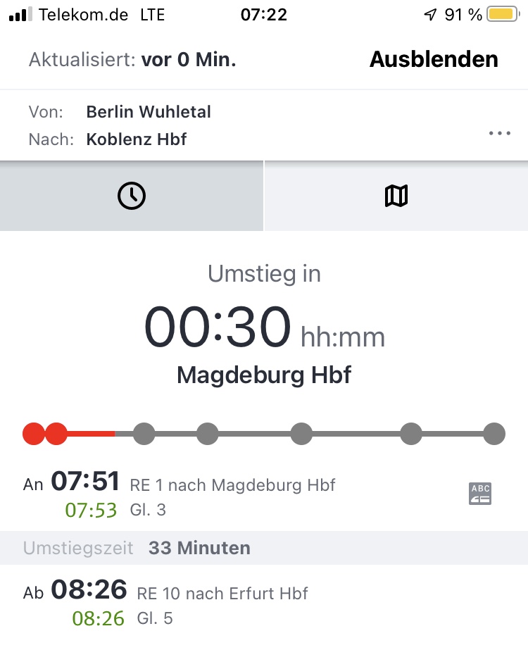 Es ist nicht mein Ansatz, aber heute will ich vom „Schlimmsten“ ausgehen und mich über jedes positive Erlebnis freuen. Um nicht von vorn herein schon in den Pendler- und Wochenendverkehr zu kommen, nehme ich die erste Möglichkeit. Sie scheint auch attraktiver zu sein, als spätere: Nur 4x umsteigen und auch nicht langsamer als die späteren Verbindungen.