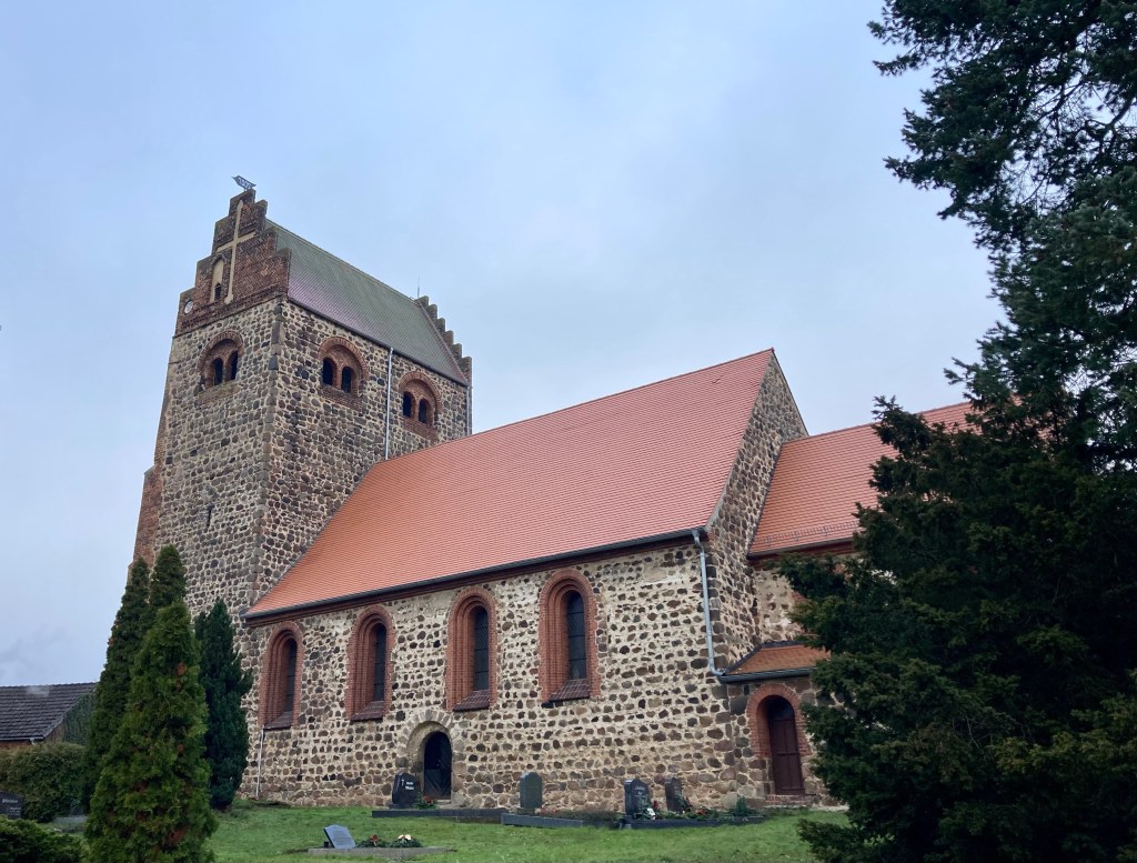 Das Prunkstück des Dorfes ist die frühmittelalterliche Wehrkirche. Ich bin mir nicht sicher, ob sie an der Straße der Romanik liegt. Das könnte sie aber. Wuchtig groß und stabil ist sie. Beeindruckend , wenn man bedenkt, aus welcher Zeit die Kirche stammt. Die Runden Granitsteine wurden mit viel Geschick zu dicken, haltbaren Mauern gefügt, in denen nur kleine Fensteröffnungen freigelassen wurden. Ohne Beton und ohne Metall! Es wurde gerade eine Trauerfeier vorbereitet, deshalb konnte ich sie mir nicht von innen ansehen. So eine Wehrkirche diente zwar der Festigung des Glaubens, aber auch als Verteidigungsanlage.