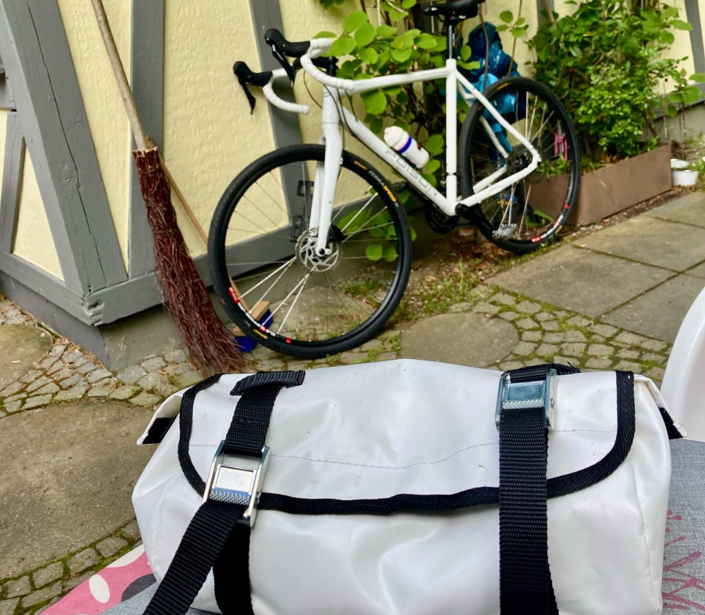 Die Rahmentasche nutzt den vollen Raum zwischen den Rohren, die exakte Aufteilung des Gepäcks muß ich noch ausbaldowern. In der Lenkertasche transportierte ich neulich meine Fotoausrüstung, die aus Kamera, Weitwinkel- Normal- und Teleobjektiv, einen Stativ und Akkuzubehör besteht.