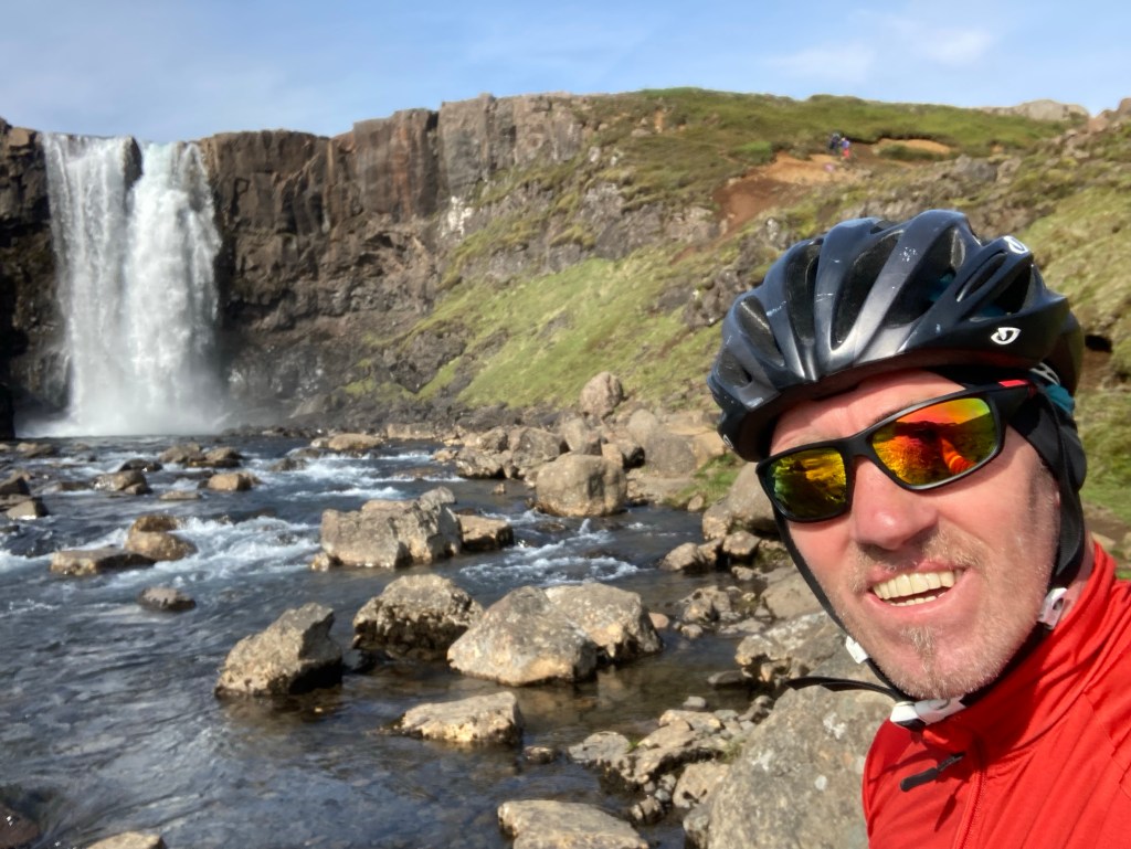 Ich düste direkt los und wollte nicht auf andere warten. Wobei Düsen sich in langsames Strampeln wandelte, denn es ging stetig und steiler werdend hinauf. Da nahm ich den ersten Wasserfall, bevor alle Fahrzeuge allmählich aus der Fähre kamen und hier hielten, um mich und mein Bike zu fotografieren. Ich fühlte mich absolut großartig. Es fand sich dann noch ein Herr aus Bremen, der mich mit Kunstfertigkeit fotografierte. Erst zuhause werde ich sehen, wie gut die Bilder geworden sind.
