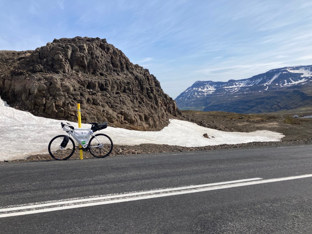 Einige Radler hatten mich dadurch überholt, aber bald war ich wieder vorne. Ich brauchte den kleinsten Gang und war kurz davor aufzugeben. Aber dann ließ die Steigung nach und ich war bald auf der Hochfläche. Links und rechts Schneefelder umgeben von Schmelzwasserseen. unglaublich, was da so über den Winter zusammen gekommen war.
