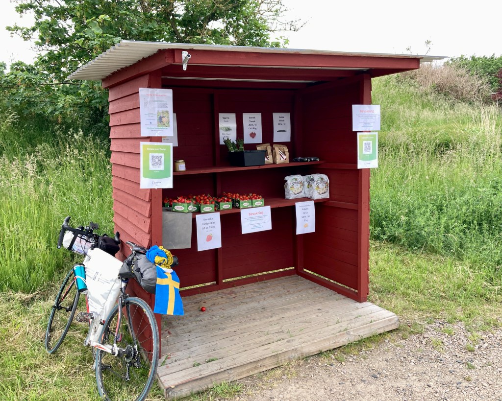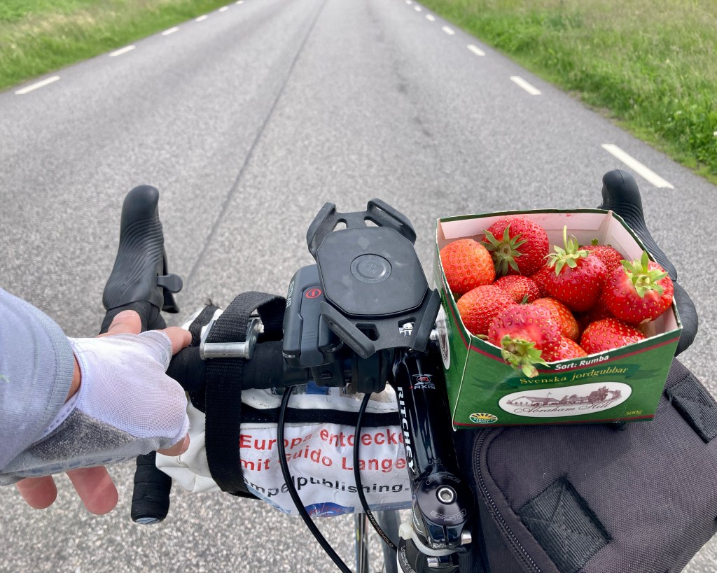 Je kürzer die Tagestour, desto besser kann man trödeln. Ich beschloss abseits der Straße 9 auf der kleinen Nebenstrecke durch die Dörfer direkt am Meer entlang zu fahren, also über den Östrakustvej. Das ist nichts vegetarisches sondern der östliche Küstenweg, denke ich. Der ging über Kåseberga. Es gab tatsächlich Berge, also Hügel. Gemessen an davor und danach eine sehr wellige Landschaft. Bevor es richtig losging mit den Bergen, kaufte ich mir eine Schale Erdbeeren – 50 Kronen , Schwedische Kronen. 1 €= 10SEK, stand auf einem der Schilder. Die Dänische Krone ist etwa 25% mehr wert. Auch der Kurs der DKR stand auf den Schildern und ich hatte als einziges Bargeld einen dänischen Fünfziger. Wer weiß, wann ich den sonst wieder hätte gebrauchen können. Dieses Bargeld hatte ich auch schon über 20 Jahre verwahrt. Den entsorgte ich jetzt.