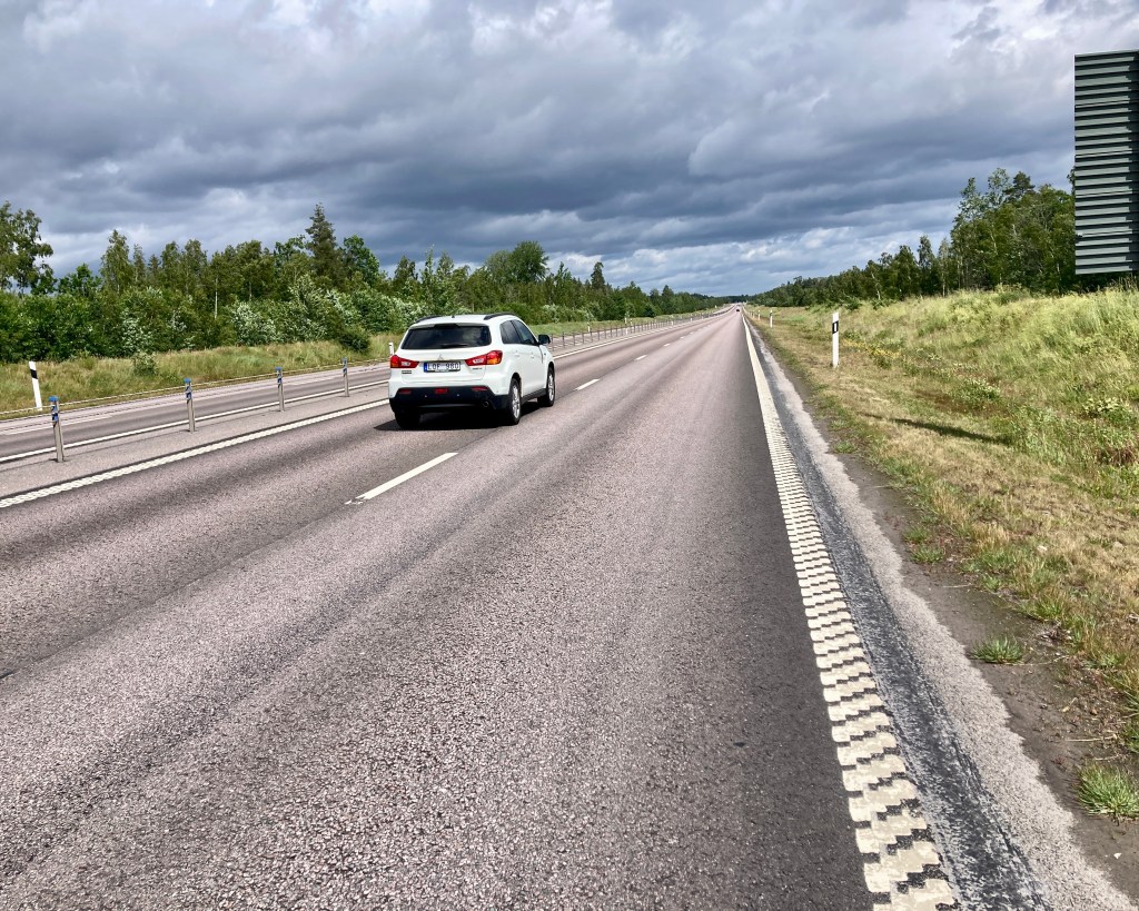 Es standen zwei Fahrer mlt ihren Autos da und rauchten. Die befragte ich. Sie sagten, das wäre die nette schwedische Polizei, es sei ein Auto mit Warnlichtern hinter ihnen gefahren, sie hätten es eskortiert und zu meiner Sicherheit mich gebeten, rauszufahren. Entweder Überbreite oder Gefahrgut, das hatte ich in der Aufregung nicht mitbekommen. Nun also dürfe ich beruhigt wieder weiterfahren, es sei erlaubt. Die Kilometer schmolzen, aber 30 km/h sind für mich kein Dauerzustand. Wir sind hier schließlich nicht bei der Tour de Fronx!