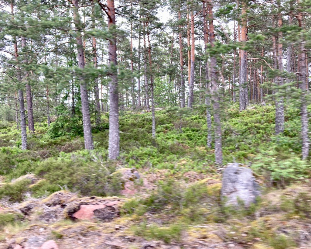 Ich mußte um einen langgezogenen See über Slingsö fahren und stellte fest: Alles Schotter – na eher Splitt. Das ist ja nun überhaupt nichts für mein Fahrrad! Es ging unendlich oft steil rauf und wieder runter und war absolut idyllisch. Jeden Moment würde ich mir einen Platten einfahren. Links und rechts ragten Granitformarionen aus dem Untergrund und der Weg mäanderte sich durch den Wald, rechts tauchte denn der langgezogene See auf. Daran einzelne kleine rote Häuschen. Mehr Schweden geht nicht!