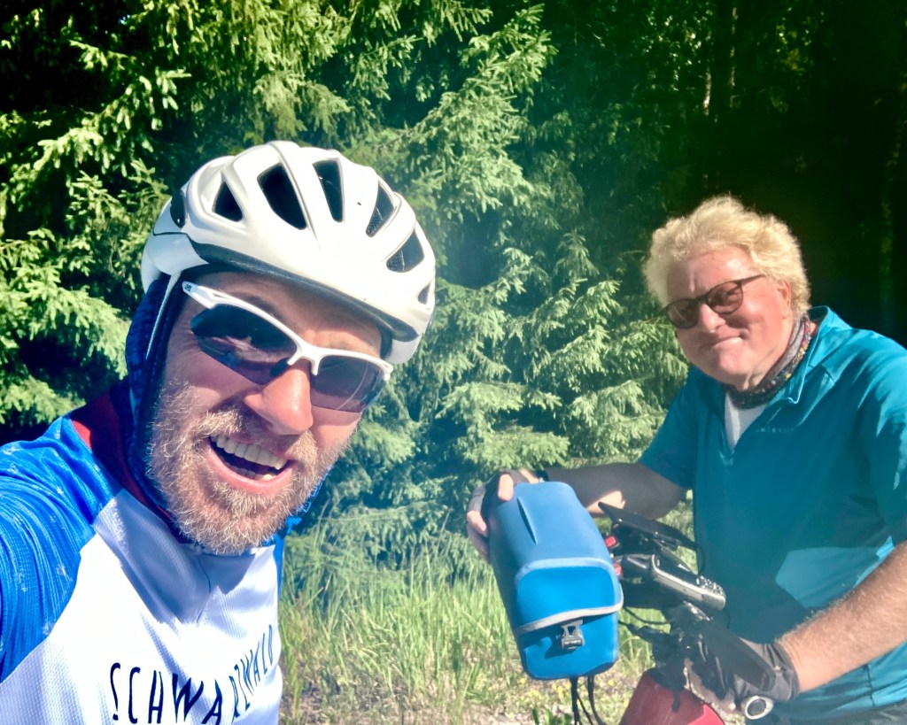 Es kam mir Hermann entgegen, der erste Tourenfahrer überhaupt hier in Finnland. Erst dachte ich, der Ex-US-Präsident wäre aufs Fahrrad umgestiegen, wegen der Haare. Aber Hermann sieht viel besser aus und ist ein super Typ. Er hat mit seinen 76 Jahren schon viel erlebt und ist seit Mitte März unterwegs. Über Barcelona, Frankreich, Italien, Albanien, den Westbalkan, Österreich, Bayern, Tschechien, Polen, die baltischen Staaten und in ab Helsinki weiter Richtung Åland Inseln, Mittelschweden nach Göteborg. Auf über 7000 km bisher konnte er Europa entdecken – eine ganz tolle Sache. Ich befragte ihn nach der Adria-Route und der wilden Hunde in Albanien. Er sagte, die seien kein großes Problem, aber die Autofahrer:innen brauchten noch ein paar Jahre, bis sie verstünden, wie gefährlich es ist, knapp an einem Radler vorbei zu Schrammen. Von den unbeleuchteten Tunneln bekam er Albträume und mußte wieder auf die italienische Seite wechseln. Gute Fahrt allezeit, lieber Hermann!