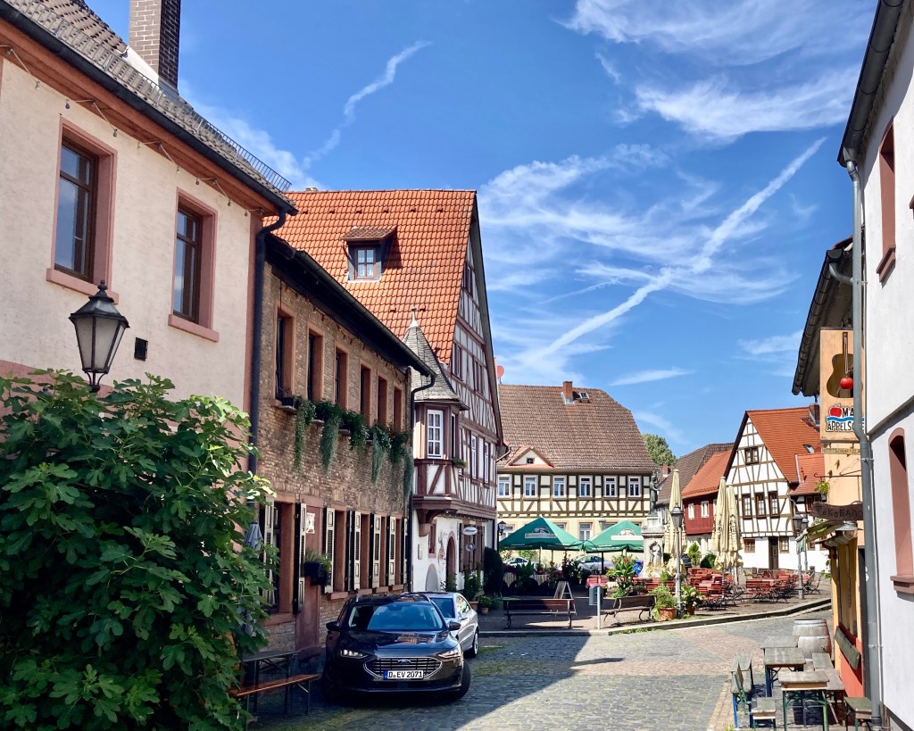 Ich freute mich schon lange auf den Mainradweg entlang der roten Sandsteinwände. Die links und rechts wie beim Grand Canyon aufragen. Jedenfalls hatte ich vor 16 Jahren diesen Eindruck, als ich hier mal mit dem Auto war. Aber so ist es nicht. Nicht für mich. Radler, die mehrere Tage rund um Miltenberg erkunden, sagten, sie hätten das so erlebt. Offenbar fuhr ich auf der „falschen“ Seite. Später sehe ich etwas davon von weitem, aber nicht halb so spektakulär, wie ich es kannte.