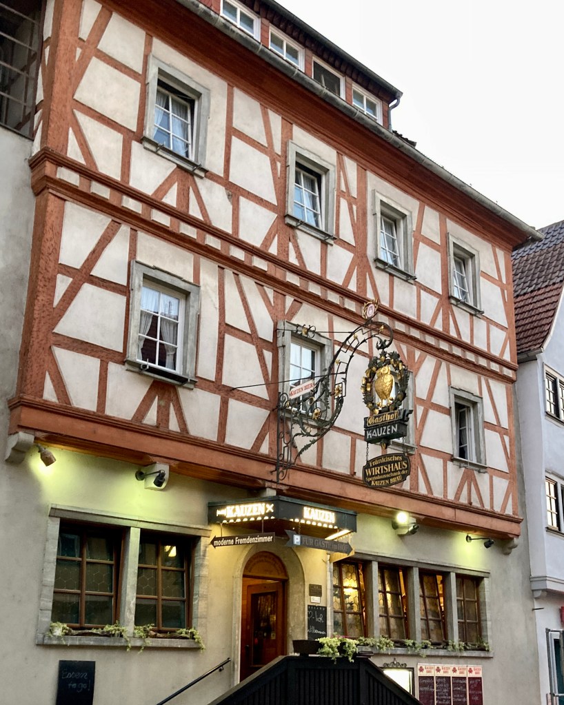 Gestern 71€ im Aschaffenburger Hof, heute 80€ im „Bären“ in Ochsenfurt. Das ist kostenmäßig absolut im Rahmen. Leider war das Restaurant im Bären wegen Urlaub geschlossen aber ich wurde im Brauereigasthof KAUZEN gut entschädigt mit Kässpätzle und Bier. Darum machte ich das Radabenteuer – um so richtig bedenkenlos reinhauen zu können.