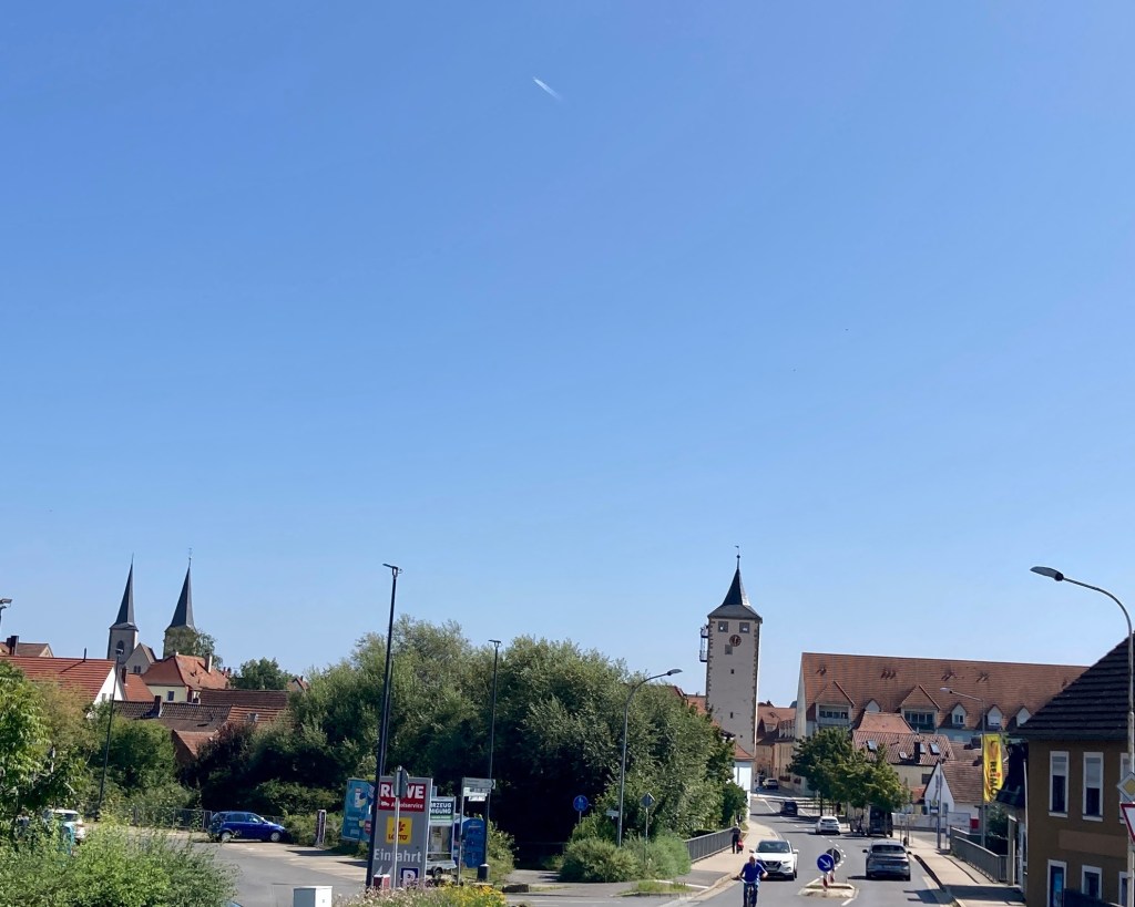Über Kitzingen, Schwarzach und Volkach ging es erstmal 60 km nach Norden bis Schweinfurt. Die Hoffnung auf Rückenwind konnte ich begraben. Stattdessen kam er umlaufend, in Böen und fühlte sich an wie ein heißer Fön.