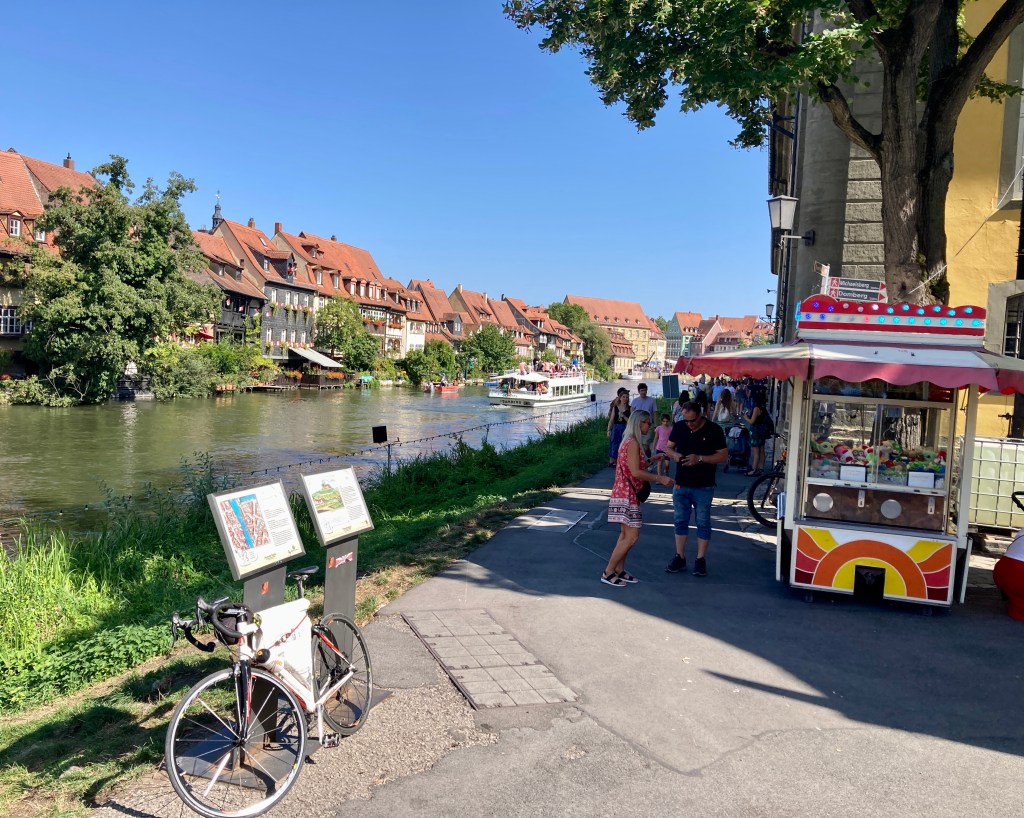 So zog ich mich mit Geduld durch das Loch und erreichte nach 120 km Bamberg, wo – in auch wieder historischer Kulisse – ein Stocherkahn und Schifferfest gefeiert wurde. Ich geriet da unvermittelt hinein und kam beinahe nicht mehr heraus. Später erzählten mir andere Rennradler, ich hätte den mit Anstand schlechtesten aller Radwege genommen. Tja Leute, der wurde mir wegen verschiedener Baustellen halt zugewiesen.
