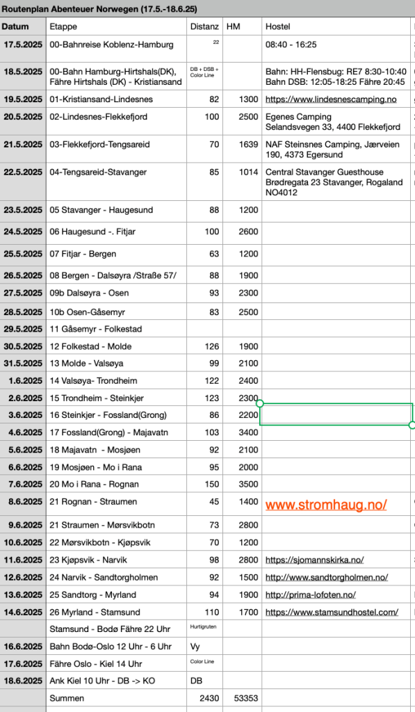 Nun noch ein letztes Mal packen, was ich von Montag an jeden Morgen machen werde. Dann nochmal die Regionalbahn checken (schade daß die Strecke Koblenz – Köln gerade gesperrt ist). Und dann geht es am Samstag früh mit 5x umsteigen bis nach Hamburg. Am Sonntag mit zwei Regionalbahnen nach Flensburg und dann weiter mit der Dänischen Staatsbahn bis zum Fährhafen Hirtshals. Von dort geht um 20:45 die Fähre nach Kristiansand. Es ist alles ambitioniert, aber bei der DB habe ich reichlich Puffer eingebaut hoffe, daß die DSB pünktlich ist.