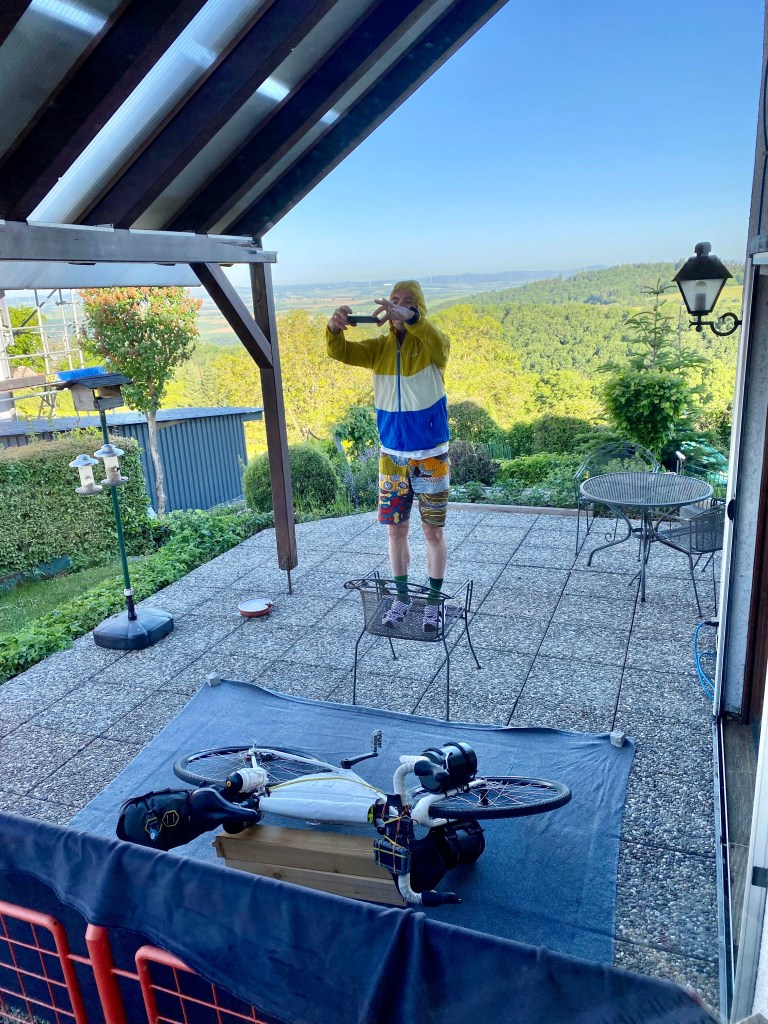Rahmen- und Lenkertasche und kleine Kameratasche sowie Arschrakete wie gehabt im Abenteuer Skandinavien und Abenteuer Island. Aber es gibt wieder kleine Neuerungen: An den Lowridern habe ich runde Plastikbehälter befestigt (eine Seite Küche, andere Seite warme Klamotten). Hoffentlich hält das. Und unter dem Sattel habe ich einen Doppelhalter für zwei Trinkflaschen montiert. Leider paßt die Arschrakete nicht genau dazwischen und ich habe sie dahinter hängen müssen. Bis jetzt hat es gut gehalten. Wir werden sehen, wie sich alles bewährt.