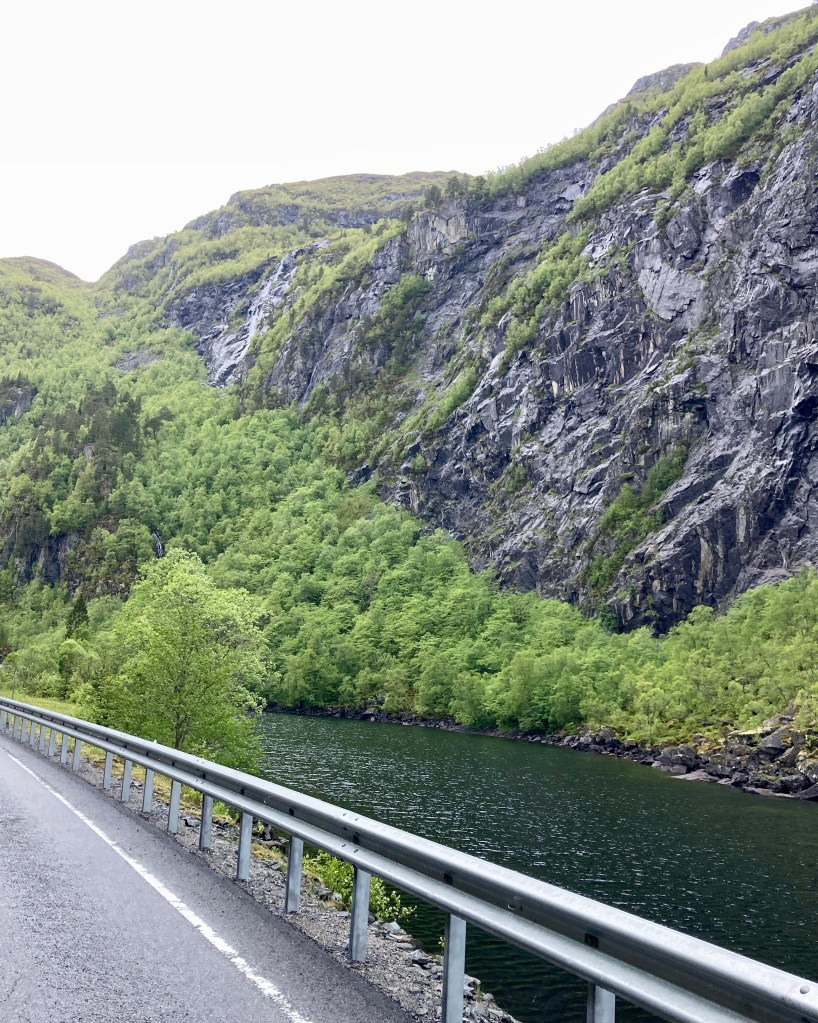 Ich war durch und nun aber Obacht, ging es steil runter auf eine Uferstraße mit mehreren Haarnadelkurven in denen auch Sand lag! Dann war ich auf der Uferstraße 661 und dann waren es nur noch 7 km bis zur Fähre Nummer 3 von heute. (Insgesamt 13 Fähren, 22 Tunnel auf 1080 km in 10 Tagen).