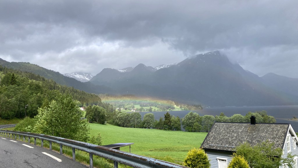 Auch bei Straumshamn musste ich wieder stoppen: Denn es lag ein Doppelter Regenbogen über dem Dorf.