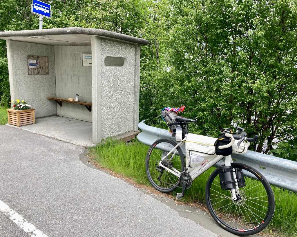 Ich war versucht, schon bei km 40 eine kleine Pause zu machen, aber das geht nicht, wenn es über 160 km werden soll. Aber im „Spar“ in Vartsal kaufte ich mir was – zwei Pizzastücke und zwei Schoktrunk. Aber Bushaltestelle war ein guter Platz.