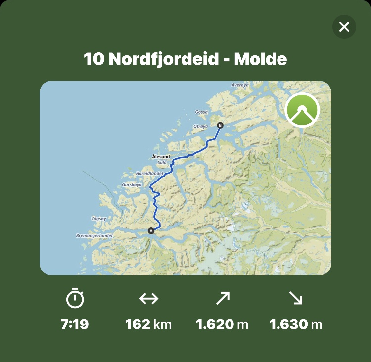 Heute hatte ich sportlich großes vor: Erst als die 35 km bis zur Fähre Folkestadt – Volda und dann die geplante Etappe bis Molde. Dann wäre ichbezogen Tage vor meinem Plan und könnte die 1000km feiern.