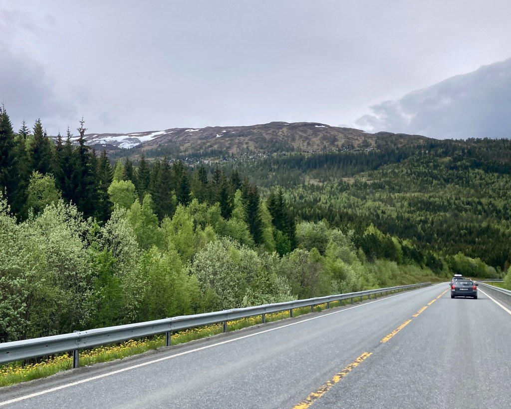 Für Leute, die in Hunsrück, Eifel, Harz oder einem anderen (Mittel-) Gebirge wohnen, was das hier nichts besonderes. Aber am Horizont kündete hier und da eine weiße, schneebedeckte Spitze an, daß es auch wieder anders kommen wird in Richtung Norden. Oben, kurz vor dem Nordkap sollen die Straßen noch so voll Schnee und Eis sein.