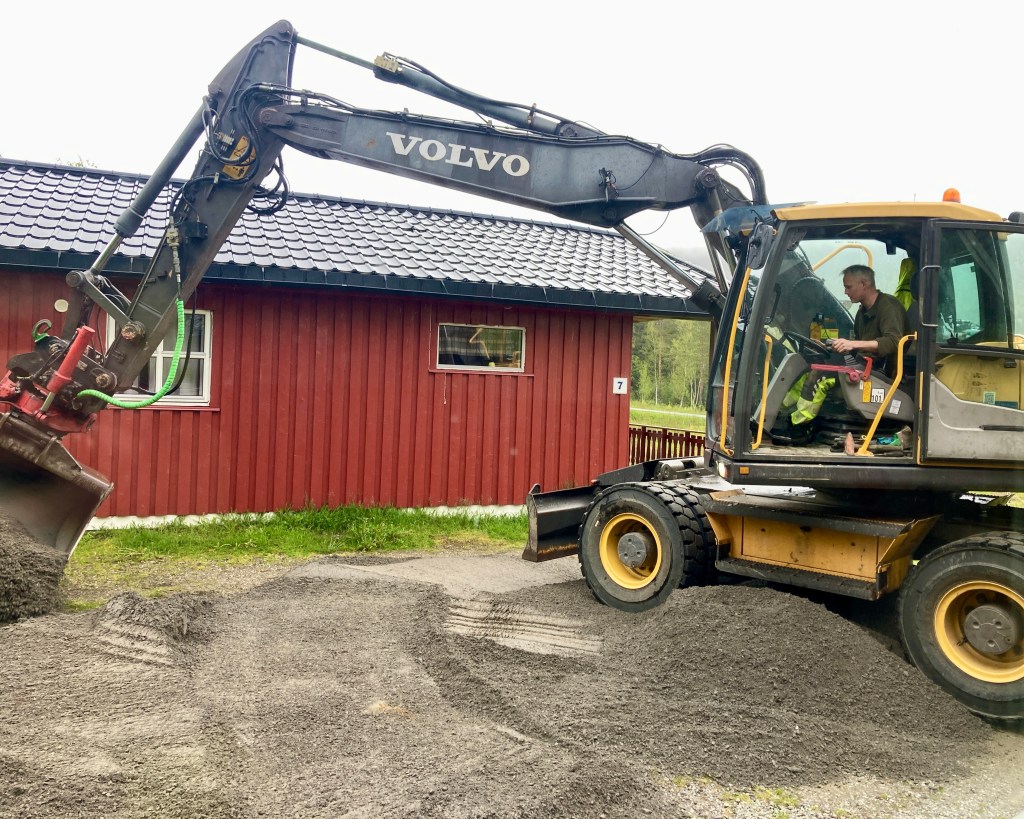 Ich dachte erst, ich träume, als ich den habe am Fenster vorbeifahren sehen. Es war wirklich einer. Mit spielerischer Leichtigkeit und Präzision planierte er den Platz zwischen Hütte 7 und 8, der gestern sehr matschig war. Nach 10 Minuten war er schon wieder fertig. Bei uns im Dorf kann sowas nur der Lars.