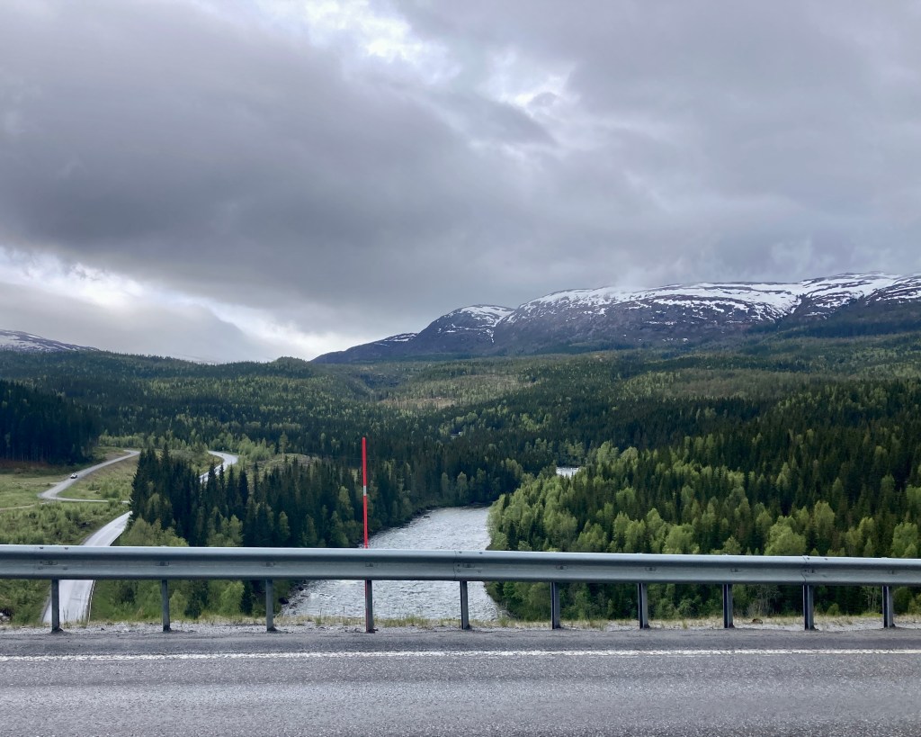 Es war ziemlich trübe, aber wenig Regen und kein Wind. Ich nahm mir vor, von Fotostops abgesehen, bis Mosjøen durchzuziehen, die Stadt anzuschauen und dann die letzten 15 km zum Campingplatz zu bummeln.