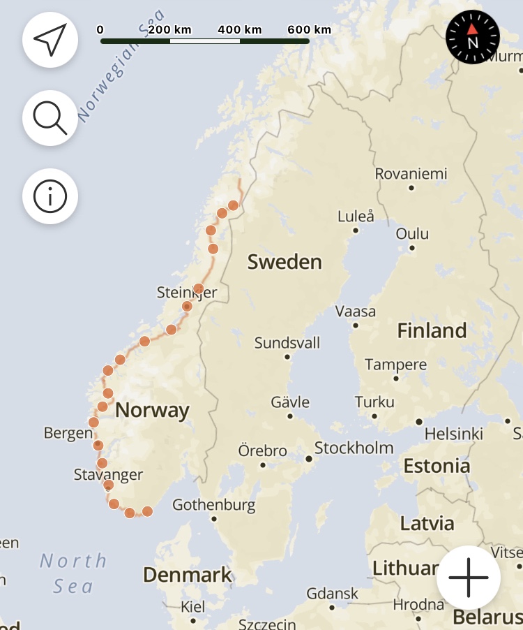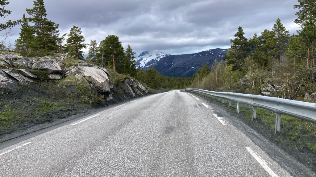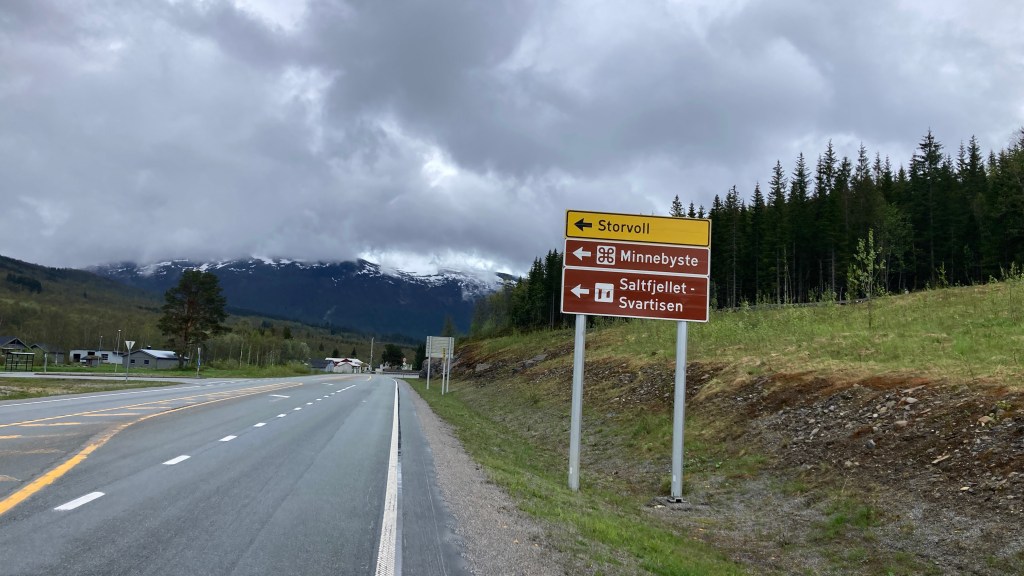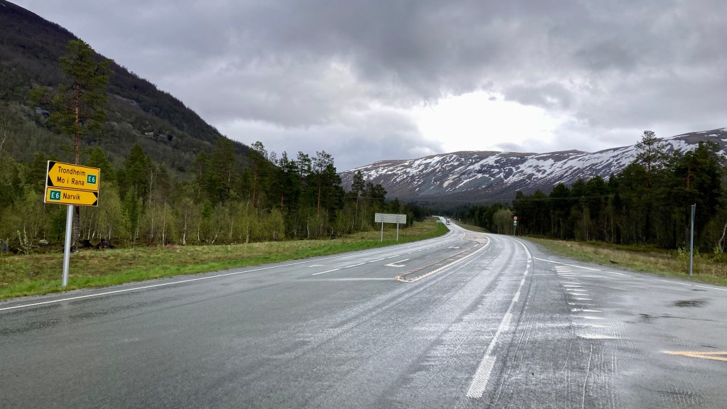 Links liegt wahrscheinlich der Svartisen Gletscher, einer der wichtigsten, und deshalb machte die E6 einen kleinen Schwenker nach Osten bis 3,5 km vor die schwedische Grenze, um dann nach Norden zu führen. Man versteht das, wenn man es sieht. Da hilft keine Karte.