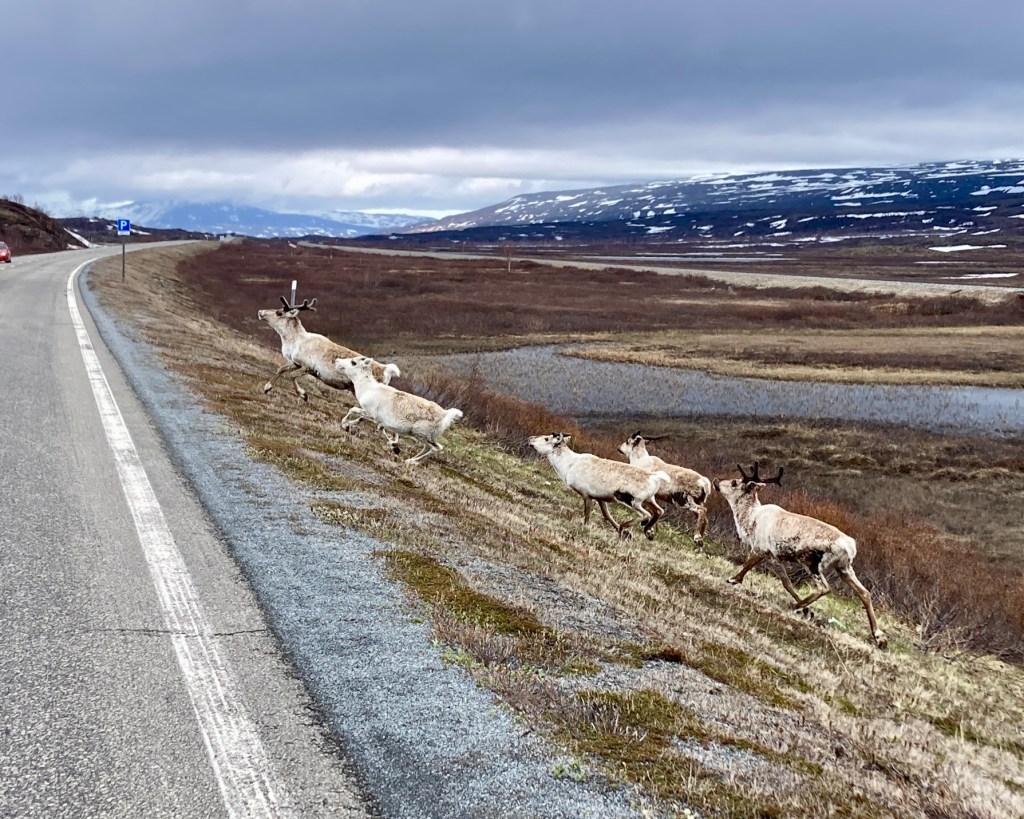 Wieder wenige km weiter sah ich Rentiere an der Straße. WaRum sie ausgerechnet zwischen mir und einem LKW über die Straße mussten- keine Ahnung. Es ging aber alles gut, weil wir beide bremsten. (Ich mit dem Handy in der Hand, denn das mußte festgehalten werden).