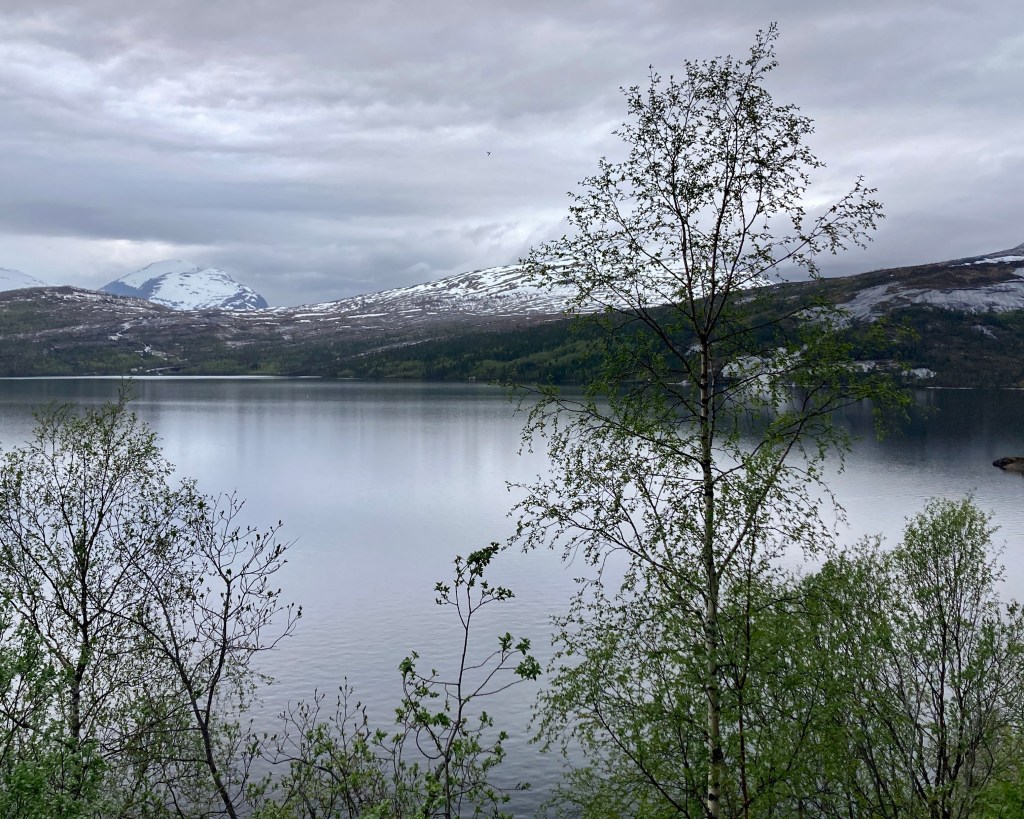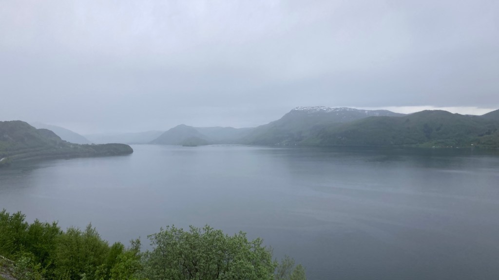 Der Mensch ist keine Maschine, aber heute wäre es beinahe Vorteilhaft gewesen. Es ging nach einem kurzen Anlauf bald in die Berge hoch und der leichte Nieselregen steigerte sich erheblich. Ich sage nicht, es macht mir nichts aus, aber ich kann damit umgehen und bin gut ausgerüstet auf meine Art – minimalistisch. In Fauske steigerte es sich zum Hagel, das perlt aber auch! Die Verlockung war da, nochmal für einen Kaffee bei km 27 anzuhalten, aber das wäre nicht gut gewesen. Ich hatte eine gewisse Balance zwischen Kälte und Wärme, Auf und Abfahrten und eine gute Stabilität auf dem Rad. Nach dem Kaffe das wieder zu finden, erforderte zu viel Aufwand.