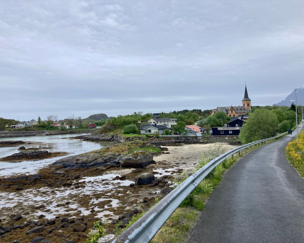 Die haben eine sehr schöne Kirche, wohl die größte auf Lofoten. Ich wollte sie standesgemäß fotografieren. Mit ihrem Holzbau ist sie auch ein Abbild der Kultur hier. Dort traf ich Zayde und Douglas aus Schottland, die hier zum Wandern hergekommen sind. Sie fotografierten mich samt der Kirche.