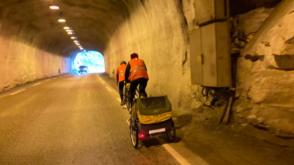 Dann kam mal wieder ein Tunnel, insgesamt Nummer 44. Er war nur 800 m lang, aber weil der Verkehr nun doch stärker ist – immerhin haben wir Freitag und Gäste wie Touristen wollen zu ihrer Hütte – war ich froh, bald durch zu sein.