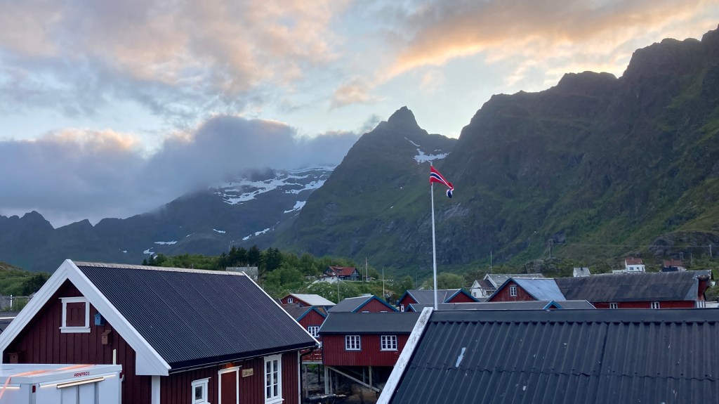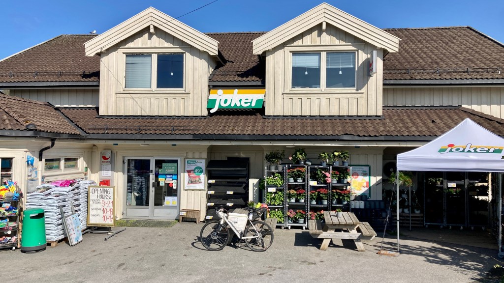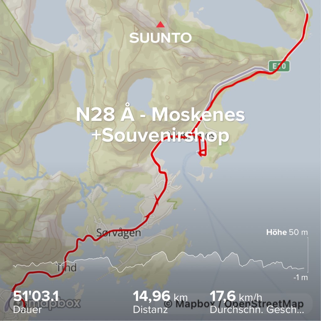 Ich wollte nochmal los um Sticker für Koffer und ein Rad in einem Souvenirshop zu kaufen. Erst fuhr ich nach rechts auf den Highway, aber anders als gestern kam es mir unglaublich weit vor. Ich drehte um und besuchte doch noch den Joker. Die hatten auch Souvenirs aber keine Lofoten-Aufkleber, leider.