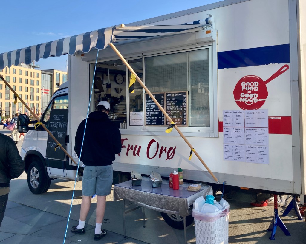 Statt ins Restaurant zu gehen, entschied ich mich für drei Gerichte an diesem Wagen: Fischsuppe, Fischburger und Pommes. Während ich auf einer Bank am Kai in der Abendsonne saß, überraschten mich Anne-Sophie und Roxane. Sie waren auf dem Weg in ein richtiges Restaurant Egon – auch gleich hier am Hafen.