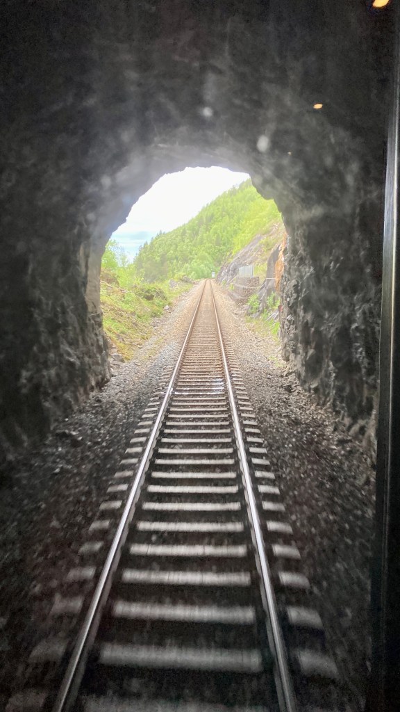 Die fantastische Streckenführung ist kein Produkt von Designern, sondern so ziemlich die einzige Möglichkeit. Unzählige Tunnel und Viadukte wurden gebaut. Fast immer fährt die Bahn durch das selbe Tal, wo auch die heutige E6 durchführt. Und damit auch nahe an meiner Route. Die allermeisten der 24 Stops nach Trondheim habe ich auf der Hinfahrt gesehen.