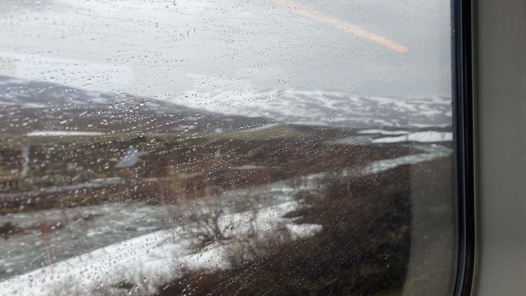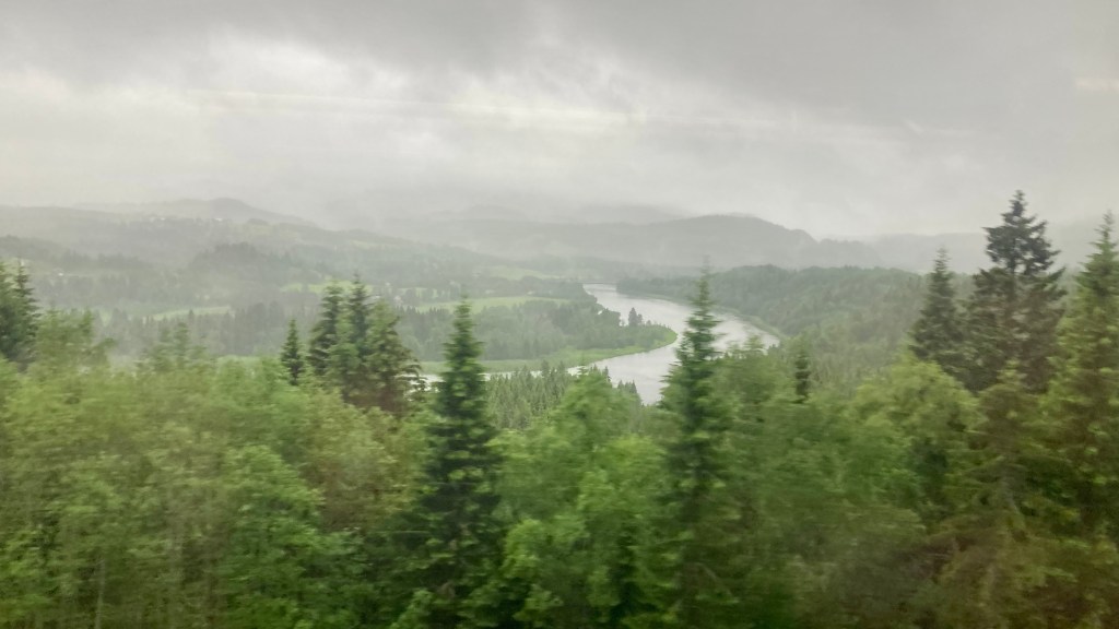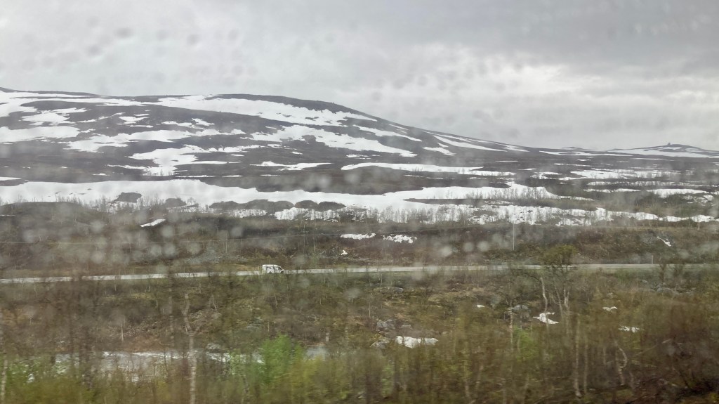 Wenn mir das einer vor drei Tagen gesagt hätte, daß ich in einem elektrischen Komfortsitz mit separater Lendenwirbelstütze, Leselampe und schwenkbarem Tablett sitze, draußen Wasserfälle, Berge, Fjorde, Tunnel – all das bisherige im Schnelldurchlauf – sehen würde. Was hätte ich da denken sollen, Krankentransport? Ich hatte keine Ahnung, was ich da gebucht hatte, und mit 125€ für 18 Stunden Bahnfahrt über 1200 km samt Radtransport war es nicht mal teuer. 120€, das ist einmal Koblenz-Berlin im ICE.