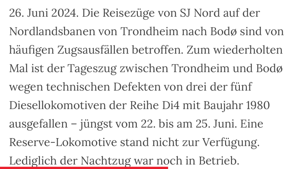 Die Bahn hat derart Probleme, daß von den fünf überhaupt verfügbaren Lokomotiven Di4 manchmal keine funktioniert. Dann werden die Fahrgäste in Busse umgeladen und die 726 km bis Trondheim gefahren. Dann verpasste man per Bahn 293 Brücken und 154 Tunnel. Beten wir einfach, daß es nicht passiert.