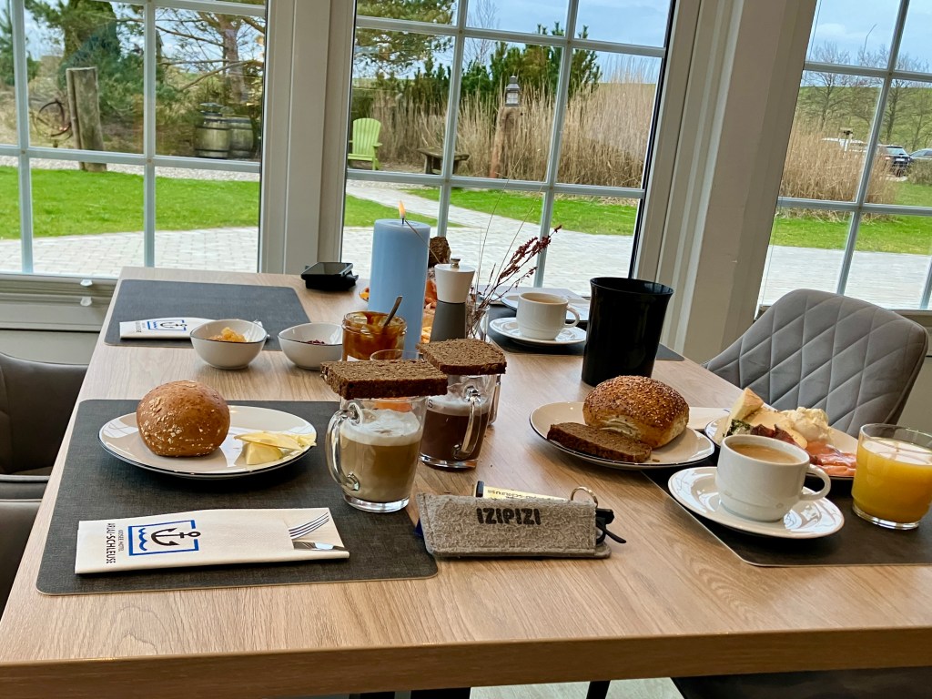 Das Frühstück ist eine Wucht – wir sind die ersten Gäste an diesem Buffet, das alles hat. Mein alter Spruch „ich brauche nur drei Vollkornbrötchen mit Butter und Marmelade“ stimmt auch heute, aber die Jungs hauen voll rein mit allem was gesund ist und Energie liefert. Ich fülle mir noch Kaffee für unterwegs ab und mache ein Käsebrot. Noch eine schöne Portion Rührei – mehr geht nicht in den Magen rein.
