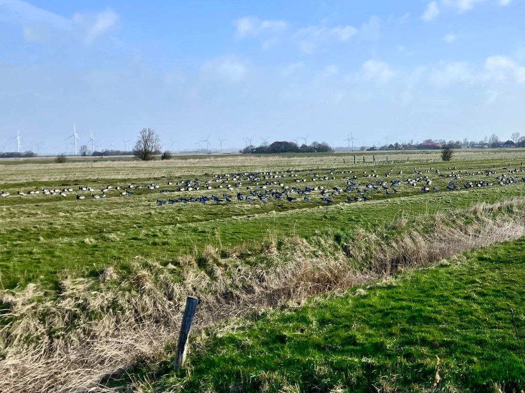 Als wir die Räder aus dem Schuppen holen, bläst es uns fast vom Parkplatz. Das kann lustig werden. Aber irgendwie ist die Route am Deich entlang 12 km bis Husum fast ein Spaziergang mit viel Rückenwind. Ich kann mich nicht erinnern, mal so gedrückt worden zu sein.