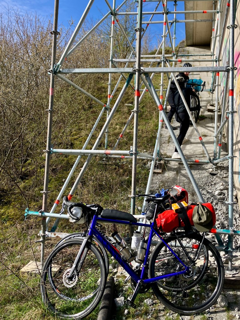 Der Radweg liegt genau unter uns an der Bahn entlang. Da müssen wir dann runter. Ein kleines Abenteuer zu zwischendurch und mal was anderes, als immer dieses gebückte fahren gegen den Wind.